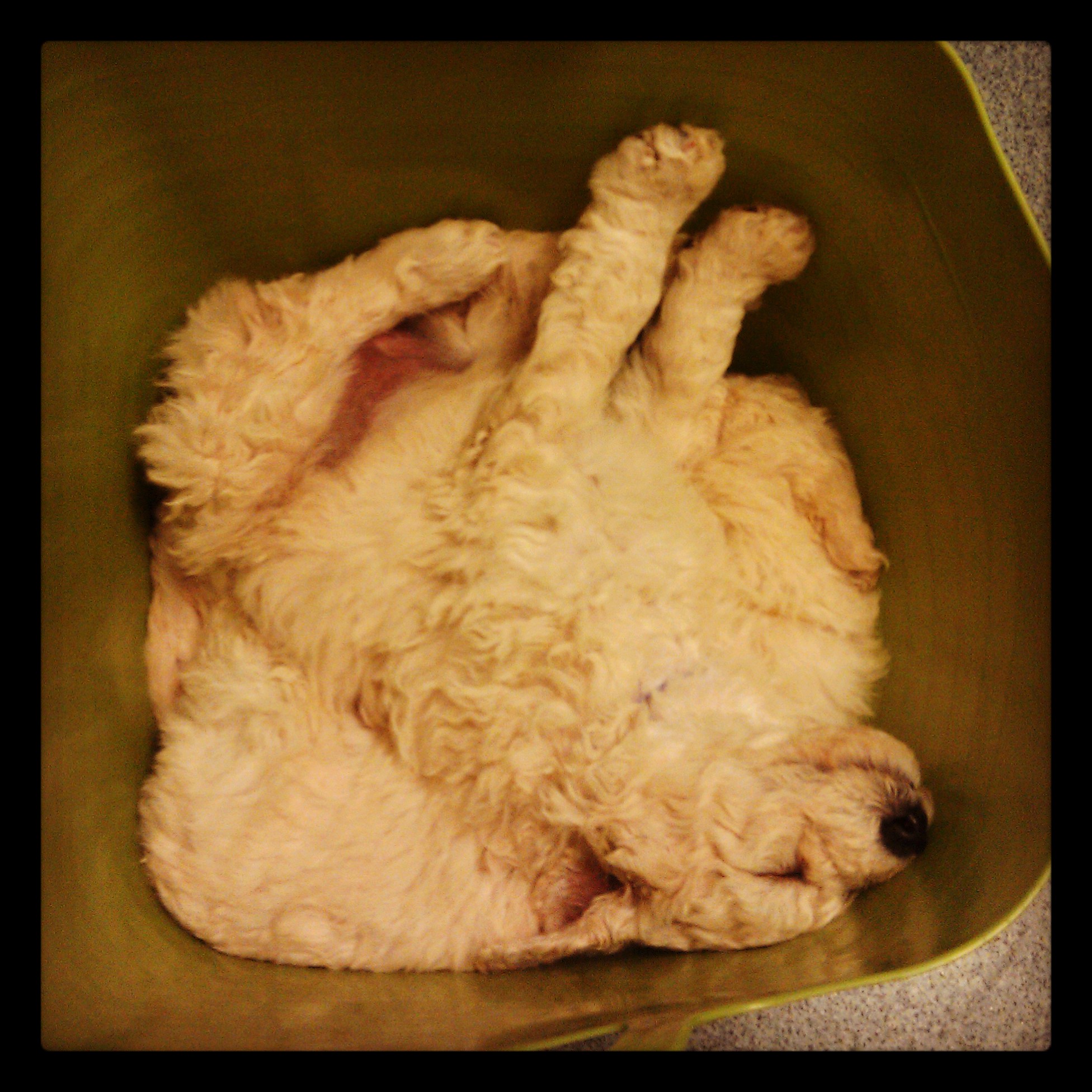 One not so fun thing for the puppies this week was that they went to the vet to get their first set of shots. They were a big hit and did a wonderful job in the car and in the office. All are doing great! It wore Purple Collar out. Poor Yellow Collar who is trying to sleep underneath her!