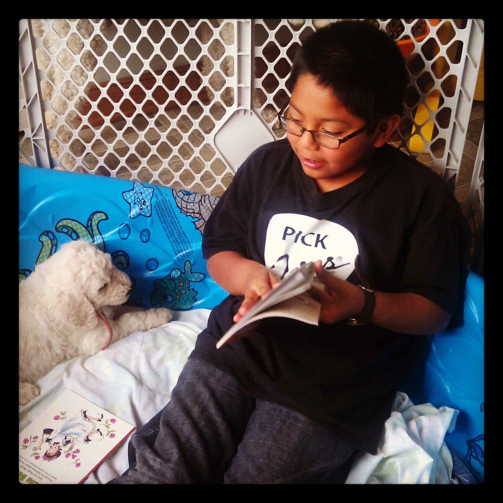 The puppies are also getting really smart. My trusty helper has been training them… or at least reading them a little Amelia Bedelia.