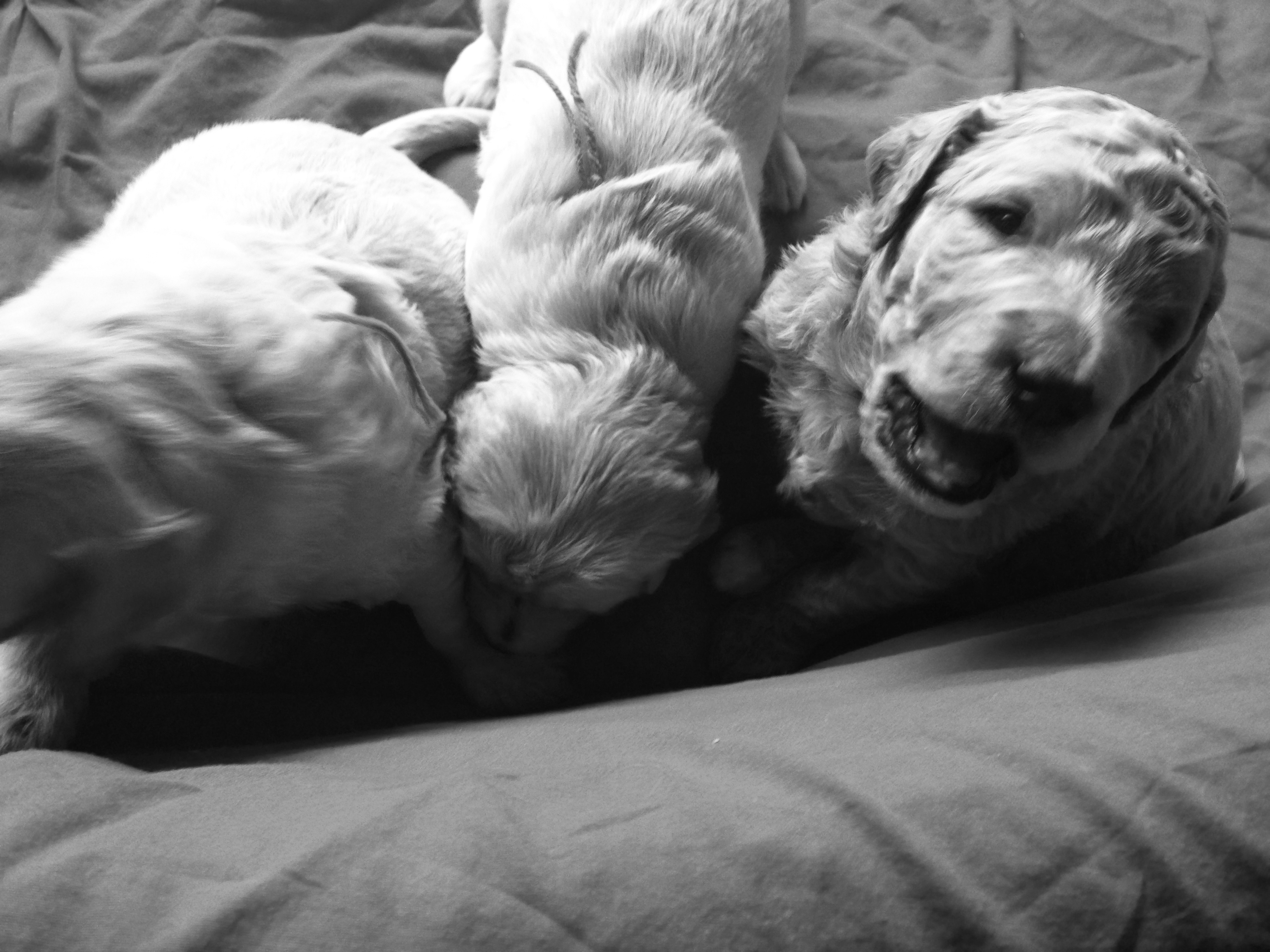 The puppies are starting to move around for quick bursts that last about a minute. Then they are exhausted! It is so funny to watch. Normally, Green wakes up and makes his sisters get up by nibbling on their ears or climbing on them. He then passes out asleep, and the girls try to play with him, He gets so tired that they can roll him over, climb on him, or chew his ears, and he is just too sleepy to move. It is the cutest thing! He is also always at the bottom of the sleeping pile! The girls love using him as a pillow!